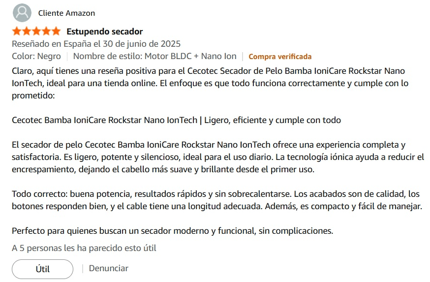 He hecho el experimento con ChatGPT. Le he pegado el pantallazo con su motor GPT 5.1 activado. Le ha costado 41 segundos llegar a una conclusión. “Yo diría que no es una reseña orgánica de un cliente, sino un texto generado (probablemente por IA) y pegado sin limpiar las frases de contexto”. Hay que conceder que el gran desafío de las reseñas falsas es su masividad. Cuando llueve es lógico que alguna gota moje. Eso sí, Amazon lleva años en una campaña global contra este fenómeno y en 2023 denunció en España a doce intermediarios de reseñas falsas.