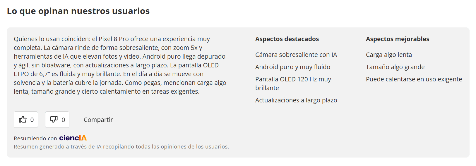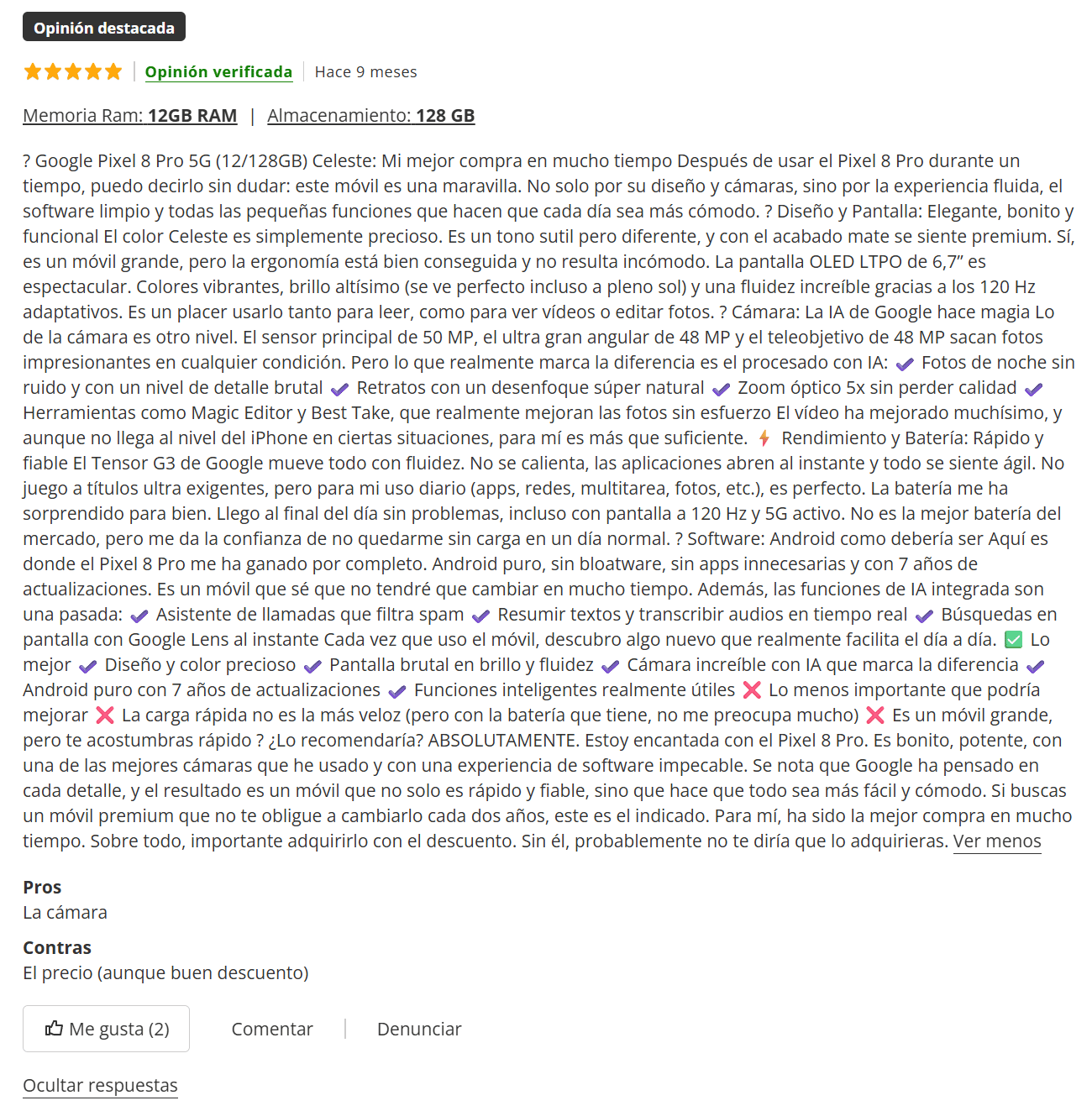 Su reseña había sido sustituida por 626 palabras de puritita IA chunga con toda la pinta de querer optimizar el artículo en motores de búsqueda. Canta muchísimo. Cris no diría “el Tensor G3 de Google mueve todo con fluidez”, diría más bien “ojísimo con el procesador”. Y lo más jodido de todo: su nombre seguía (sigue) firmando esta reseña, que está etiquetada como una “opinión destacada” (es la primera que sale en la página del artículo) y como “opinión verificada”, lo que supuestamente garantiza que la reseña la hizo “el mismo usuario que realizó la compra”. Bueno.
